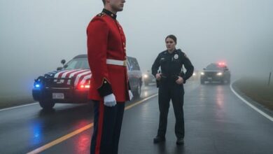 The misty Virginia morning hung heavy, clinging to the fields and softening the edges of the world as a convoy of black vehicles rolled slowly along a quiet country road. Their engines were a low, respectful hum against the stillness. At the heart of the procession was a hearse, its…